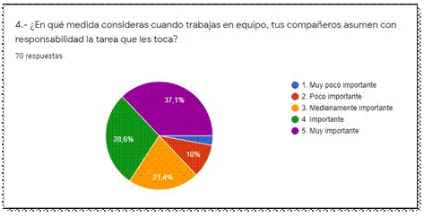 Un 37.1% y el 28.6% consideran que a través del trabajo en equipo se asume con responsabilidad la tarea asignada, sin embargo, un 21.4% y el 10% de estudiantes creen que al trabajar en equipo no todos asumen sus tareas con responsabilidad, esto nos lleva a meditar que las directrices dadas por los docentes deben ser claras y precisas para cumplir los objetivos planteados (Gráfico Nº4).