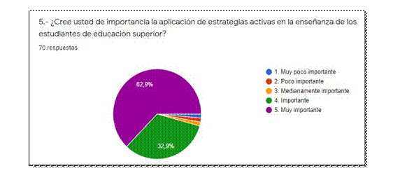 El 62.9% y el 32.9% de los encuestados creen importante la aplicación de estrategias activas en la enseñanza de los estudiantes en la educación superior, esto se debe que, a través de estas, se contribuye al desarrollo de habilidades, destrezas y competencias que requieren en su formación profesional (Gráfico Nº5).