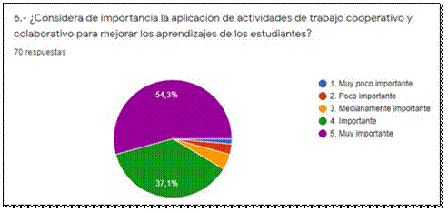 Un alto porcentaje de los estudiantes encuestados consideran de importancia la aplicación de actividades de trabajo colaborativo para mejorar sus aprendizajes, porque les ayuda a conectar la nueva información con aquellos saberes que ya adquiridos, esto contrasta con un bajo porcentaje de estudiantes que lo consideran poco importante (Gráfico Nº6).