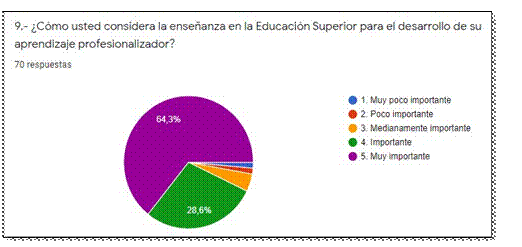 El 64.3% y el 28.6% consideran importante la enseñanza en la Educación Superior para el desarrollo de su aprendizaje profesionalizador porque proporciona al futuro docente los conocimientos y dominios de enfoques, métodos, procesos y estrategias pedagógicas para su desempeño profesional (Gráfico Nº9).