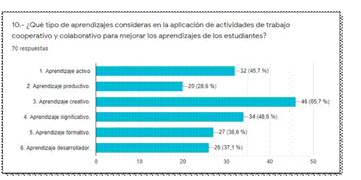 Los estudiantes encuestados consideran que actividades enmarcadas dentro del aprendizaje creativo, activo, significativo, formativo, desarrollador y productivo permiten mejorar sus aprendizajes, lo que permite replantear el trabajo áulico e implementar nuevas prácticas docentes dentro de una pedagogía activa (Gráfico Nº10).