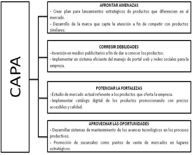 Una vez elaborado el análisis DOFA, se procede a elaborar el Modelo CAPA (Figura 3), el cual cumple con la función de disminuir los riesgos de la elaboración que se presenten en un producto y trabaja de la mano con la matriz DAFO.