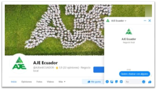 AJE mantiene redes sociales que son canales virtuales por los cuales se puede comunicar con sus clientes para mostrarles noticias, promociones y otros anuncios. Estos canales se pueden usar para crear una mejor experiencia con los clientes que manejan y se sienten más cómodos usando la tecnología, ellos podrían comunicarse con AJE por las redes sociales como Facebook e Instagram para solicitar servicios tales como que le tomen el pedido o hasta quejarse de la mala atención recibida por su vendedor. Además, estos canales estarán disponibles 24/7 y los mensajes de los clientes podrán ser recibidos por un chatbot con inteligencia artificial que responderá dudas de los clientes al instante y asociado directamente con la base de datos de las rutas próximas por recorrer, de manera que cuando un cliente indique que desea hacer un pedido, el mimo proporcione su ubicación y con esto se agenda la visita. Seguidamente se presenta un capture del chatbot en facebook (Imagen 2)