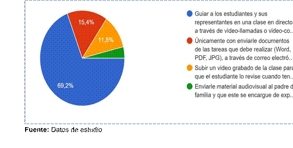 De igual manera resultó interesante conocer cual de esos recursos permite una mayor eficiencia en el desarrollo de las destrezas estudiantiles, con un 69,2% en la guía directa de los estudiantes y representantes a través de video llamadas o video conferencias, es decir, visualizar rostros y facciones del interlocutor resultó ser de mejor proyección, tal como lo demuestra el Gráfico (1).