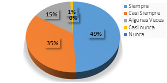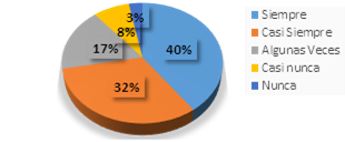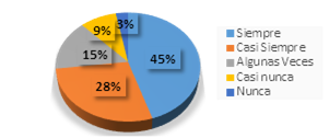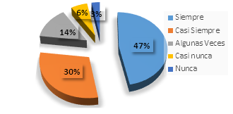 Con ese resultado se coloca de manifiesto que el 73% de los entrevistados está dispuesto a realizar estudios de idiomas por medio del uso de la tecnología siempre o casi siempre, tal como lo plantea García-Cormenzana et al (2017), quienes manifiestan que la forma de fortalecer y facilitar el aprendizaje de un segundo idioma puede ser posible por medio del empleo de las diferentes Tecnologías aplicadas a la Información y la Comunicación, las cuales han sido constituido como la manera de cambiar la imagen de las instituciones educativas, posicionando al estudiante con una visión integradora y autónoma, postura que es necesaria para estar en consonancia con las nuevas dinámicas de integración global.