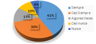 El uso de plataformas interactiva para aprender un idioma, el cuarenta y uno por ciento (41%) de la población entrevistada, respondieron que siempre están dispuesto al uso de plataformas interactivas para el aprendizaje de un idioma, mientras que el treinta por ciento (30%) de muestra, indicaron que casi siempre usan plataformas interactivas para el aprendizaje de un idioma, para el trece por ciento (13%) de los interrogados, expusieron que algunas veces utilizan las plataformas interactivas para el estudio de un idioma, sin embargo el diez por ciento (10%) de los estudiados afirmaron que casi nunca utilizan las plataformas interactivas para el aprendizaje de un idioma y para el seis por ciento (6%) de los encuestados, dijeron que nunca utilizan las plataformas interactivas para el aprendizaje de un idioma.