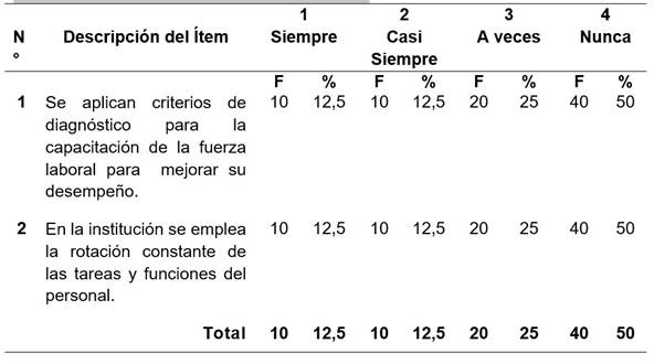 Estos resultados conllevan a deducir que se aplican en bajos porcentajes criterios de diagnóstico para la capacitación de la fuerza laboral en busca de mejorar su desempeño en la institución hospitalaria.