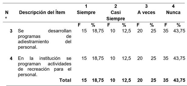 Lo que significa que, para los consultados, es evidente la falta de desarrollos de programas de adiestramiento del personal que labora en los departamentos administrativos y mantenimiento del Hospital General “Dr. Israel Ranuarez Balza”.