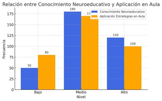 El análisis muestra una correlación positiva entre el nivel de conocimiento neuro educativo y la aplicación de estrategias en el aula. Los docentes con mayor formación en neuroeducación tienden a aplicar más estrategias didácticas basadas en neurociencia, lo que indica la importancia de fortalecer la capacitación en esta área.